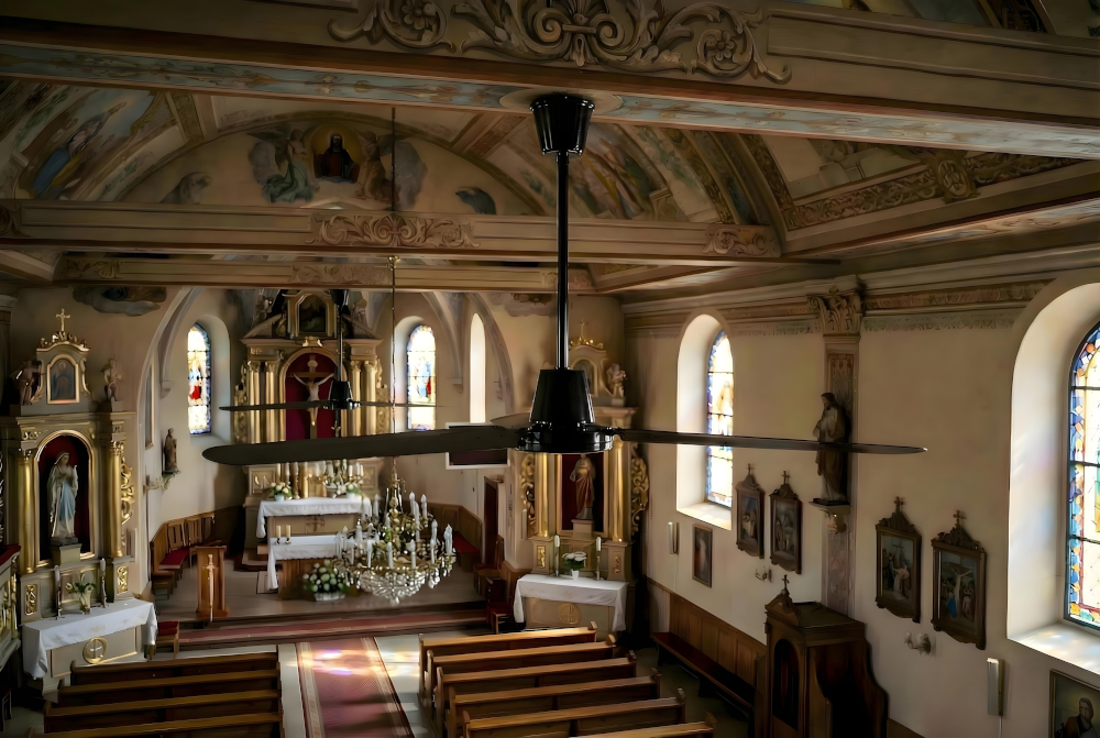 Równomierny rozkład temperatury eliminuje efekt „zimnych ławek” oraz przeciągów przy posadzce. Dzięki łagodnej cyrkulacji powietrza temperatura w całej przestrzeni świątyni staje się stabilna i komfortowa – zarówno podczas mszy, jak i wydarzeń okolicznościowych.