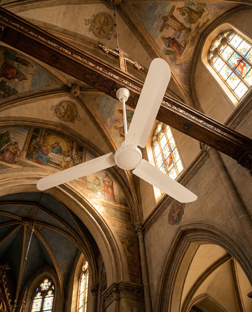 W kościołach ciepłe powietrze naturalnie unosi się pod sklepienie, gdzie często osiąga temperaturę nawet o kilka stopni wyższą niż przy poziomie wiernych. Destryfikatory równomiernie rozprowadzają nagromadzone pod sufitem ciepło w dół, ograniczając straty energii i zmniejszając zużycie systemów grzewczych. W praktyce oznacza to realne oszczędności w sezonie grzewczym.